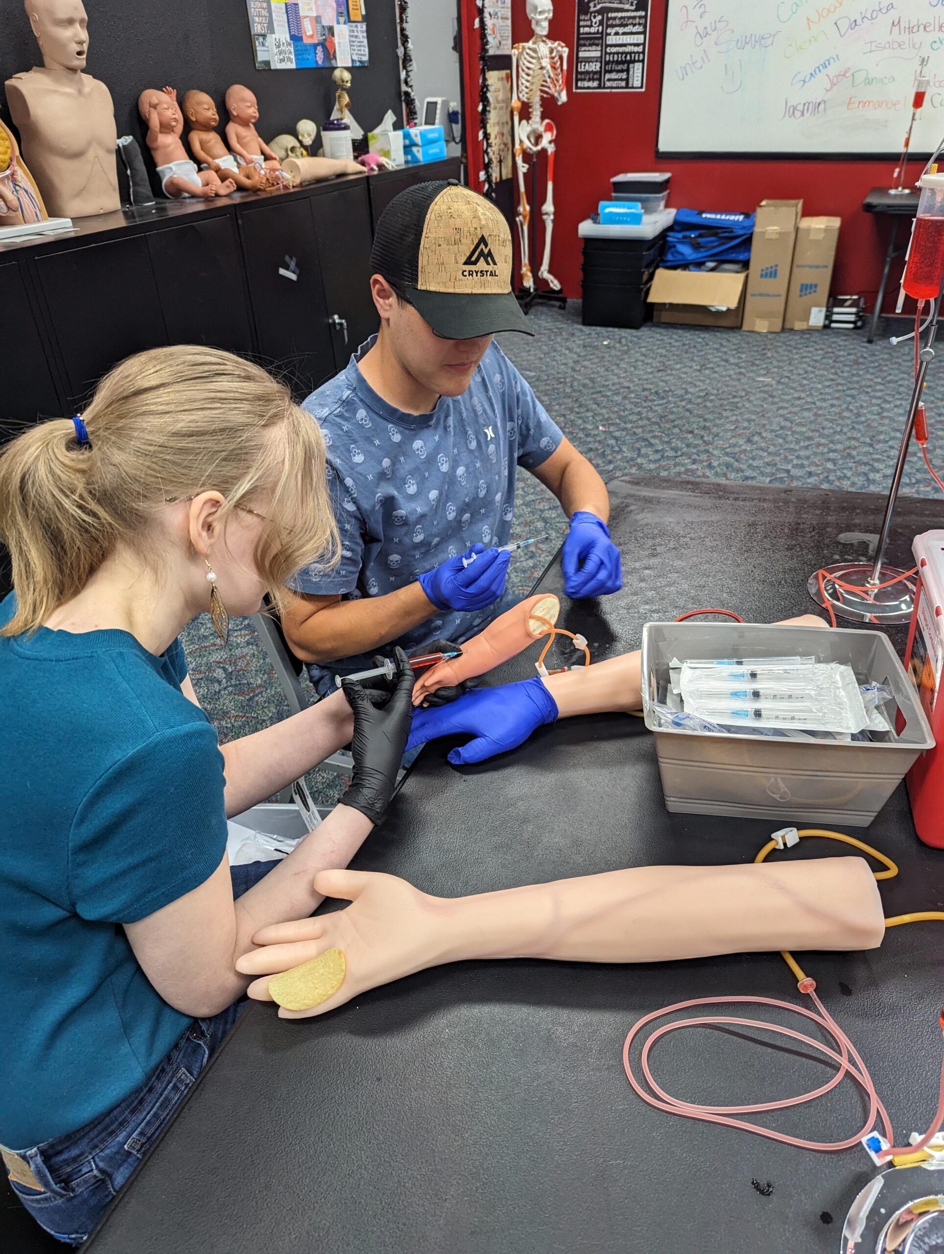 In Ms. Kasper's Medical Assisting clinical class. The students were putting their skills to practice by doing blood draws on adult and infant practice arms. They really like the realistic hands on activities and this one is always a favorite. #GoDragons