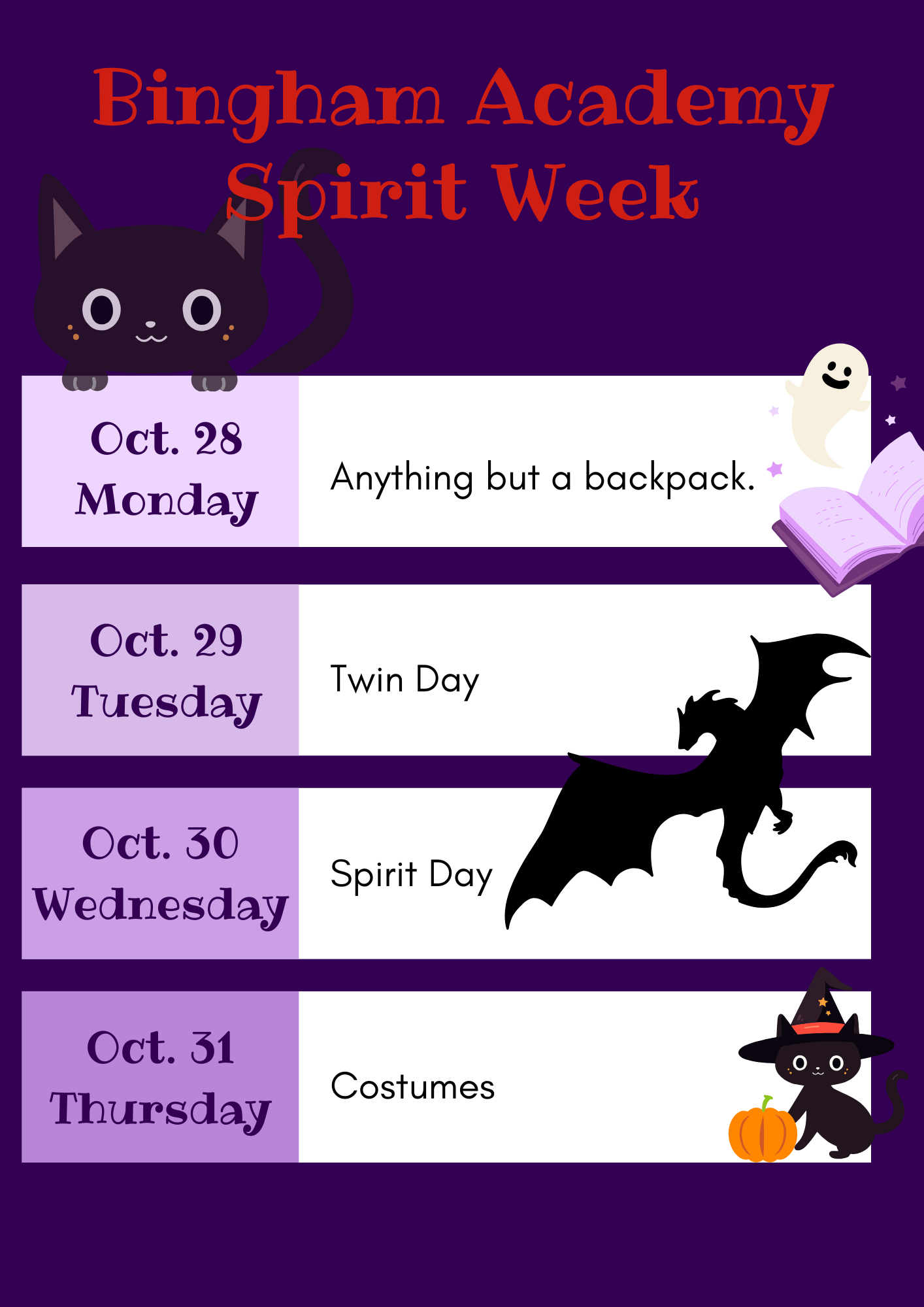 Spirit Week starts Monday, October 28. The grade level with the highest participation gets an hour lunch! #GoDragons!